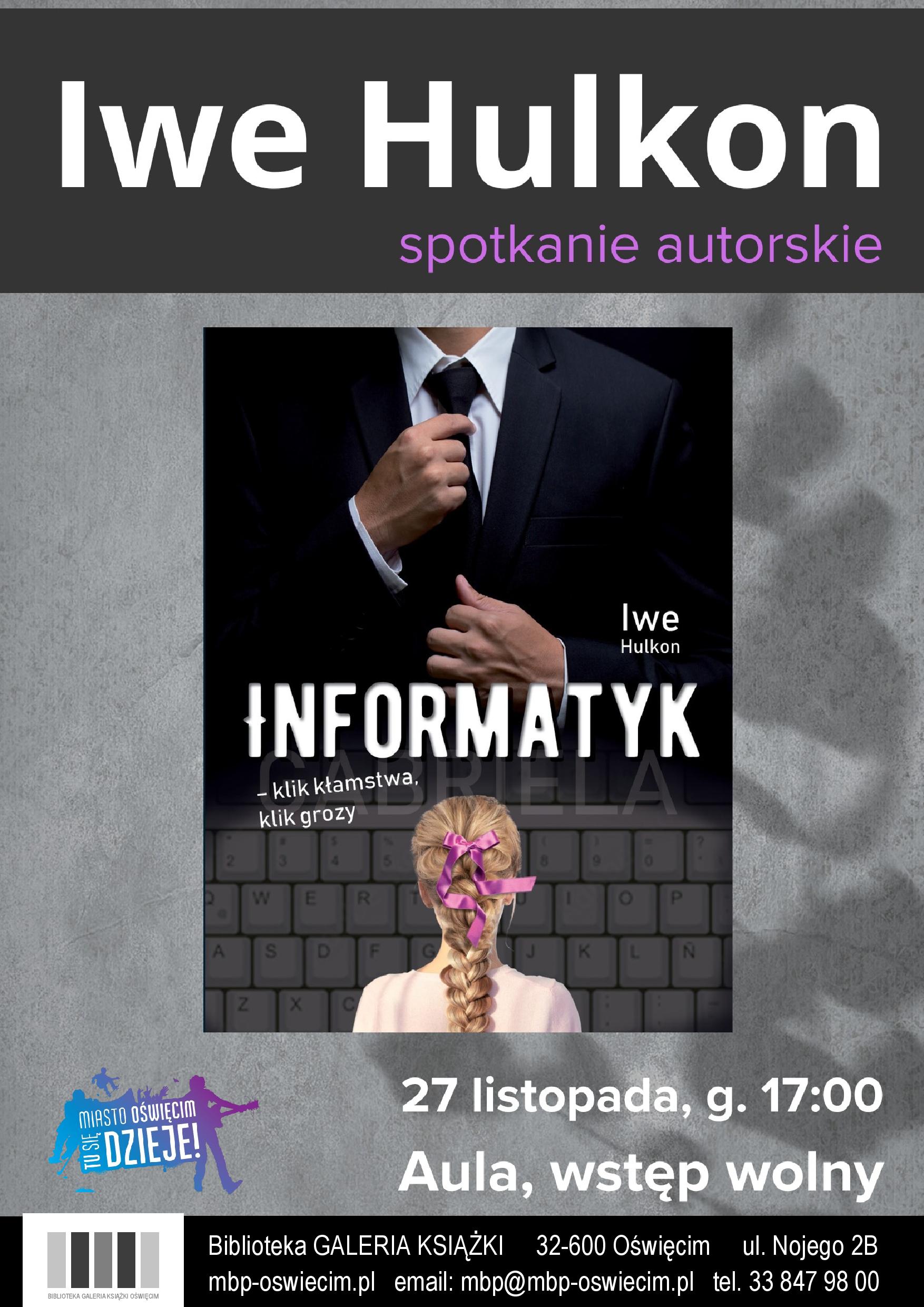Zapraszamy na spotkanie autorskie z Iwe Hulkon, autorem debiutanckiej powieści „Informatyk. Klik kłamstw”. Spotkanie odbędzie się 27 listopada 2025 roku o godzinie 17.00 w Auli.