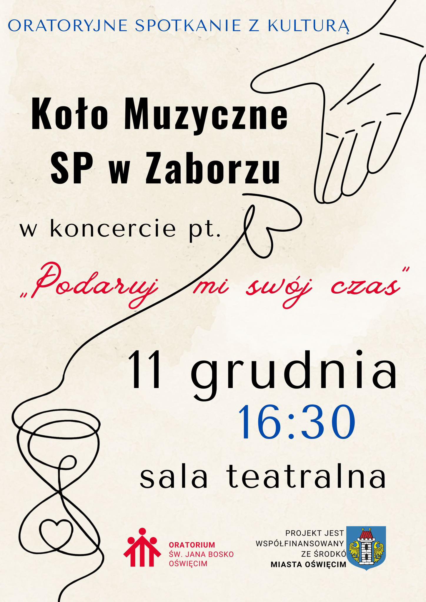Kolejne Oratoryjne spotkanie z kulturą ???? Zapraszamy na spotkanie z kulturą w czwartek 11.12 o 16:30 w sali teatralnej Zakładu Salezjańskiego. Wystąpi dla nas Koło Muzyczne Szkoły Podstawowej w Zaborzu pod opieką p. Agnieszki Kalety w koncercie pt. "Podaruj mi swój czas". Do zobaczenia! ❤️ Projekt jest współfinansowany ze środków Miasta Oświęcim.