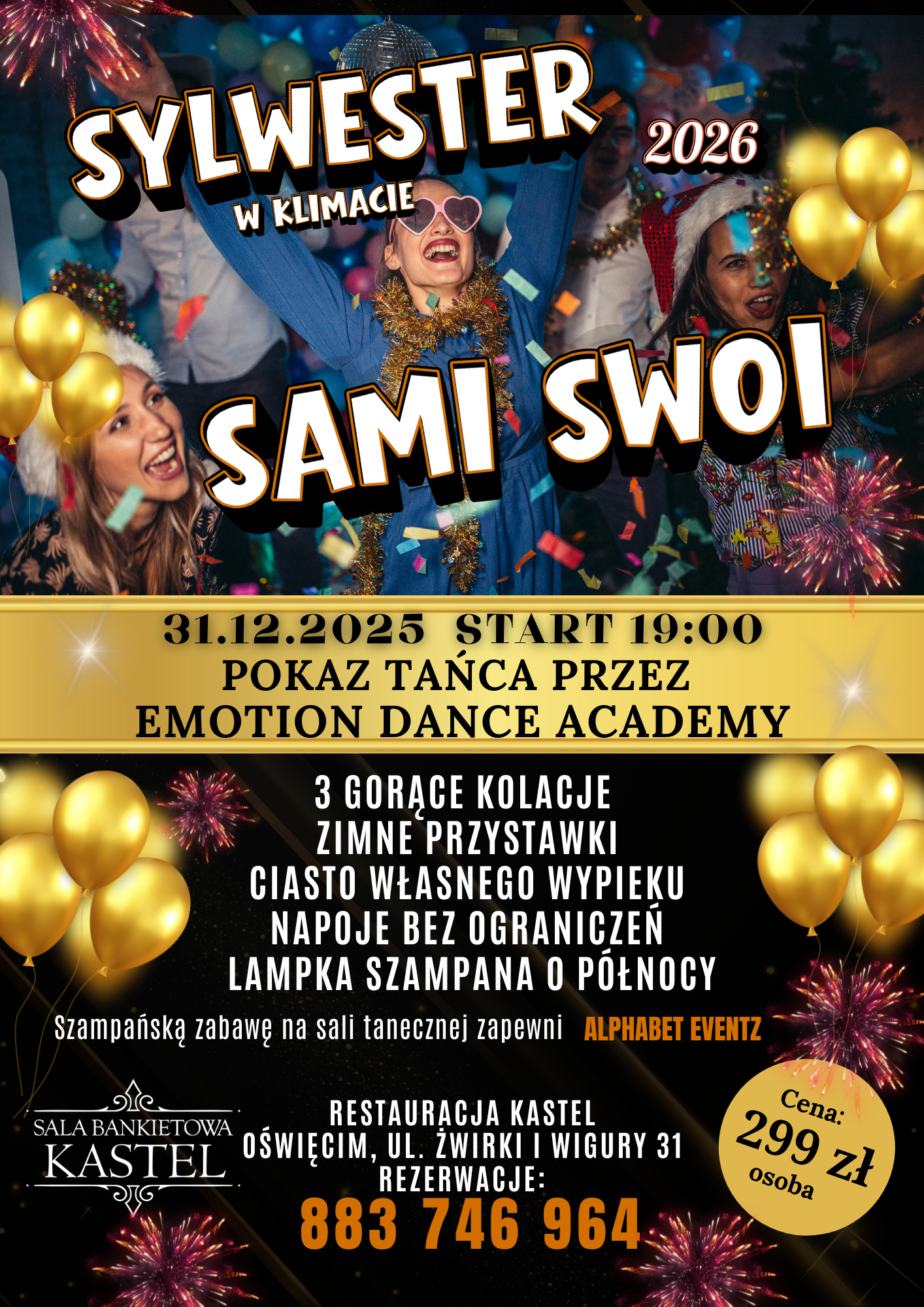 ZAPRASZAMY NA SYLWESTERA DO RESTAURACJI KASTEL W OŚWIĘCIMIU NA WESOŁO W KLIMACIE " SAMI SWOI" Podczas sylwestra odbędzie się: pokaz tańca przez eMotion Dance Academy MENU: 3 GORĄCE KOLACJE ZIMNE PRZYSTAWKI CIASTO WŁASNEGO WYPIEKU NAPOJE BEZ OGRANICZEŃ LAMPKA SZAMPANA O PÓŁNOCY Szampańską zabawę na sali tanecznej zapewni: Alphabet eventz Cena: 299 zł od osoby Zapraszamy Rezerwacje: 883-746-964 Restauracja Kastel Oświęcim, ul. Żwirki i Wigury 3