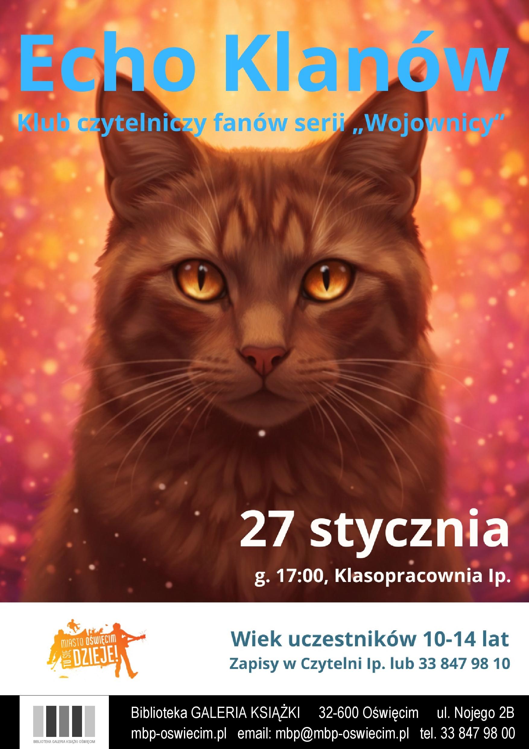 Zapraszamy do Klubu czytelniczego fanów serii "Wojownicy ". Klub przeznaczony jest dla dzieci w wieku 10-14 lat. 27 stycznia godz. 17.00, Klasopracowania I piętro. Zapisy pod numerem telefony 33-84-798-10