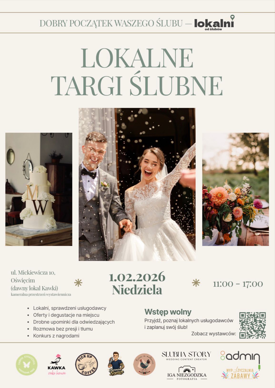 Już 1 lutego 2026 (niedziela) zapraszamy przyszłe Pary Młode na kameralne TARGI ŚLUBNE w Oświęcimiu. Poznacie sprawdzonych lokalnych usługodawców i w spokojnej atmosferze zaplanujecie swój wielki dzień – bez presji i tłumów. ul. Mickiewicza 10, Oświęcim (dawny lokal Kawki) 11:00–17:00 Wstęp wolny Na miejscu: ✔️ rozmowy z wystawcami ✔️ darmowa degustacja tortu ✔️ drobne upominki ✔️ konkurs z nagrodami Nie może Cię zabraknąć!