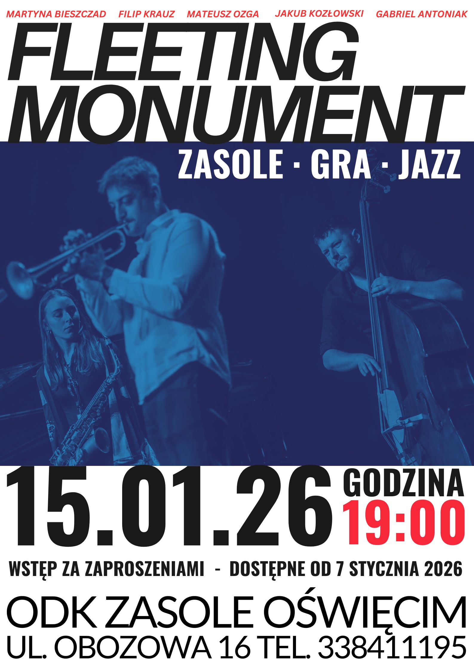 15.01.2026 godz.19.00 zapraszamy do Osiedlowego Domu Kultury Zasole w Oświęcimiu na koncert jazzowy Fleeting Monument, w ramach projektu Prezentacje z cyklu Małe formy muzyczne. Wstęp za zaproszeniami do odbioru w ODK Zasole od 7 stycznia 2026 r.