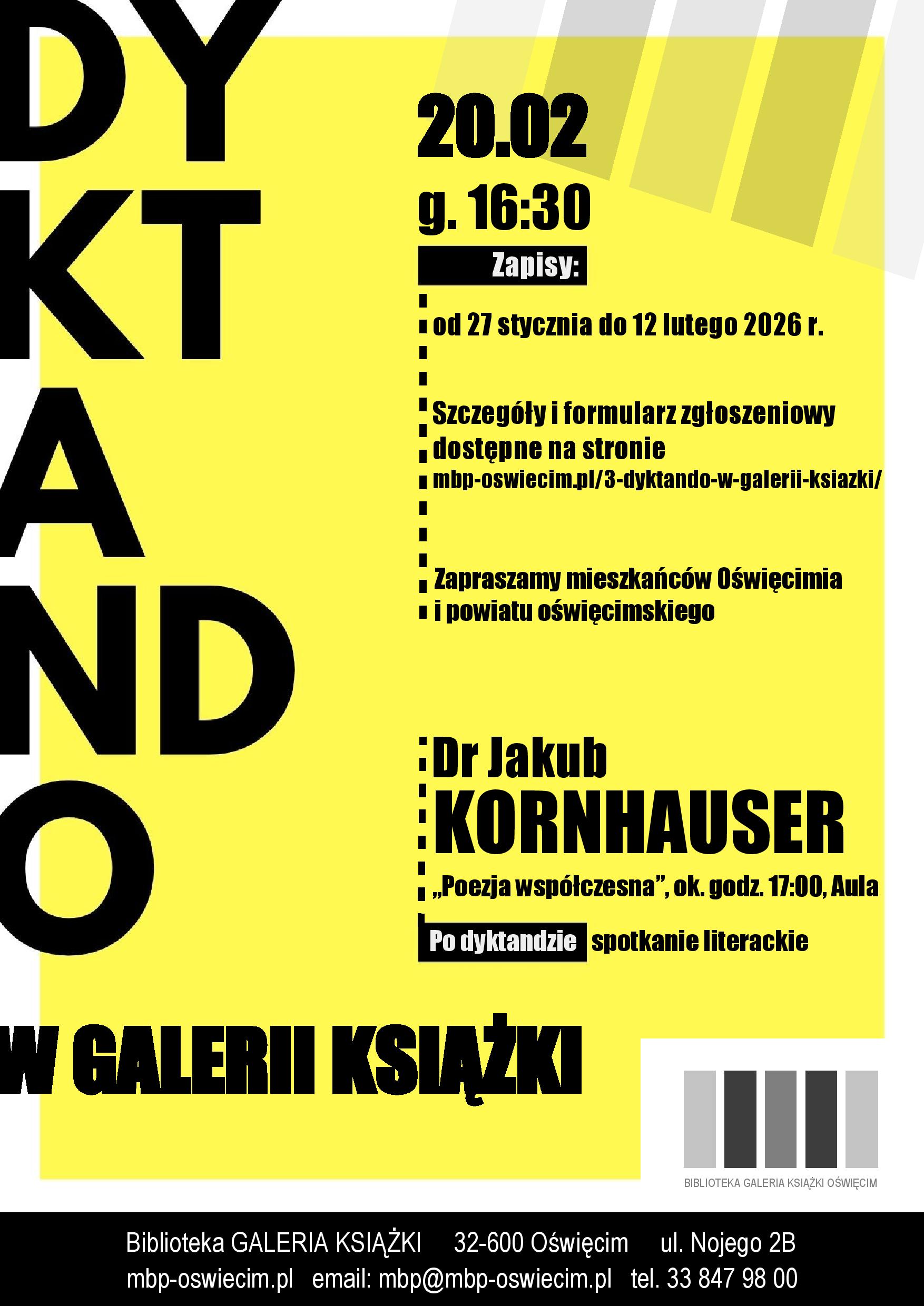 Po zakończeniu dyktanda zapraszamy wszystkich na spotkanie poświęcone poezji współczesnej z dr. Jakubem Kornhauserem - literaturoznawcą, poetą, tłumaczem, eseistą, redaktorem, ok. g. 17:00