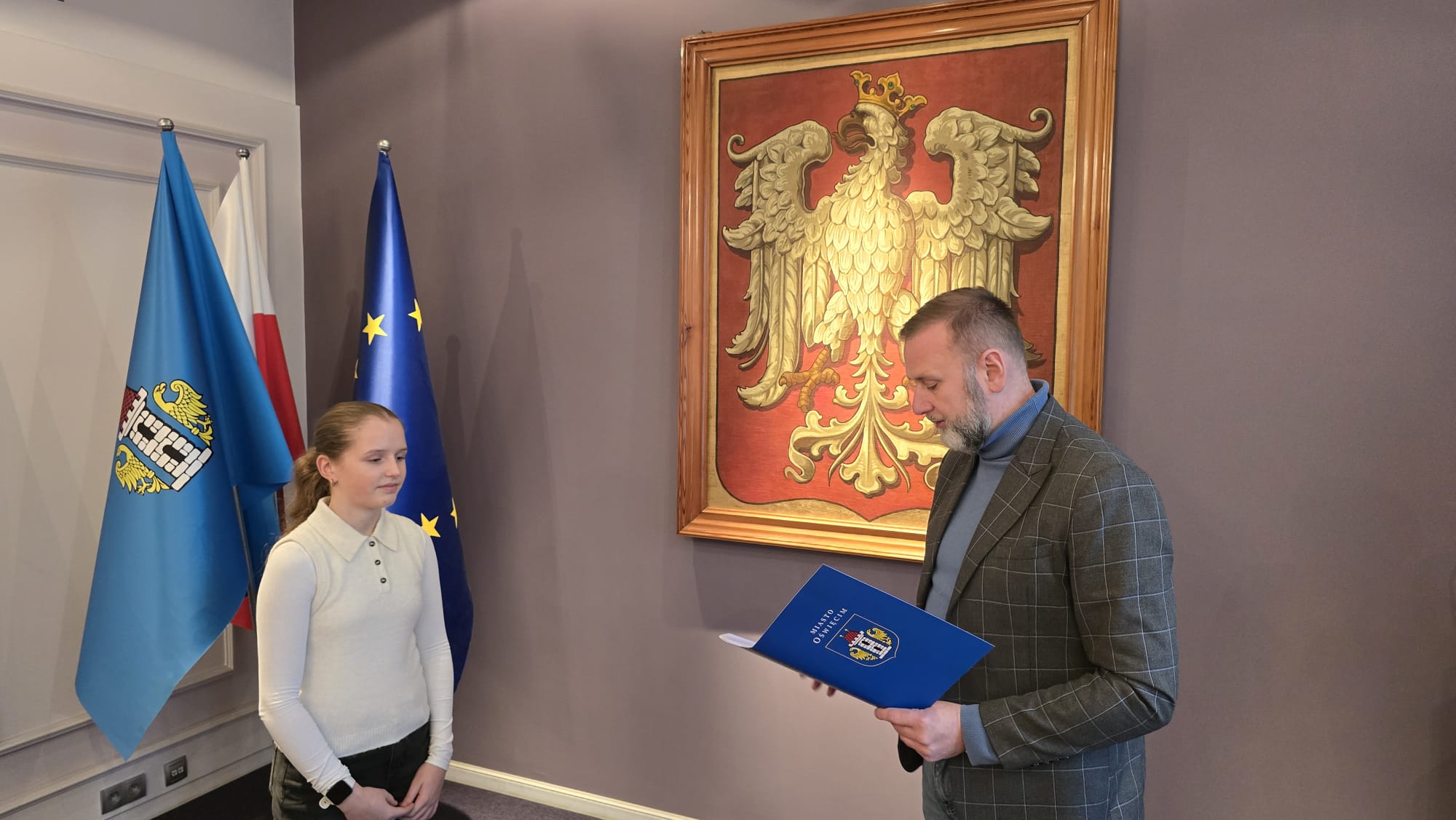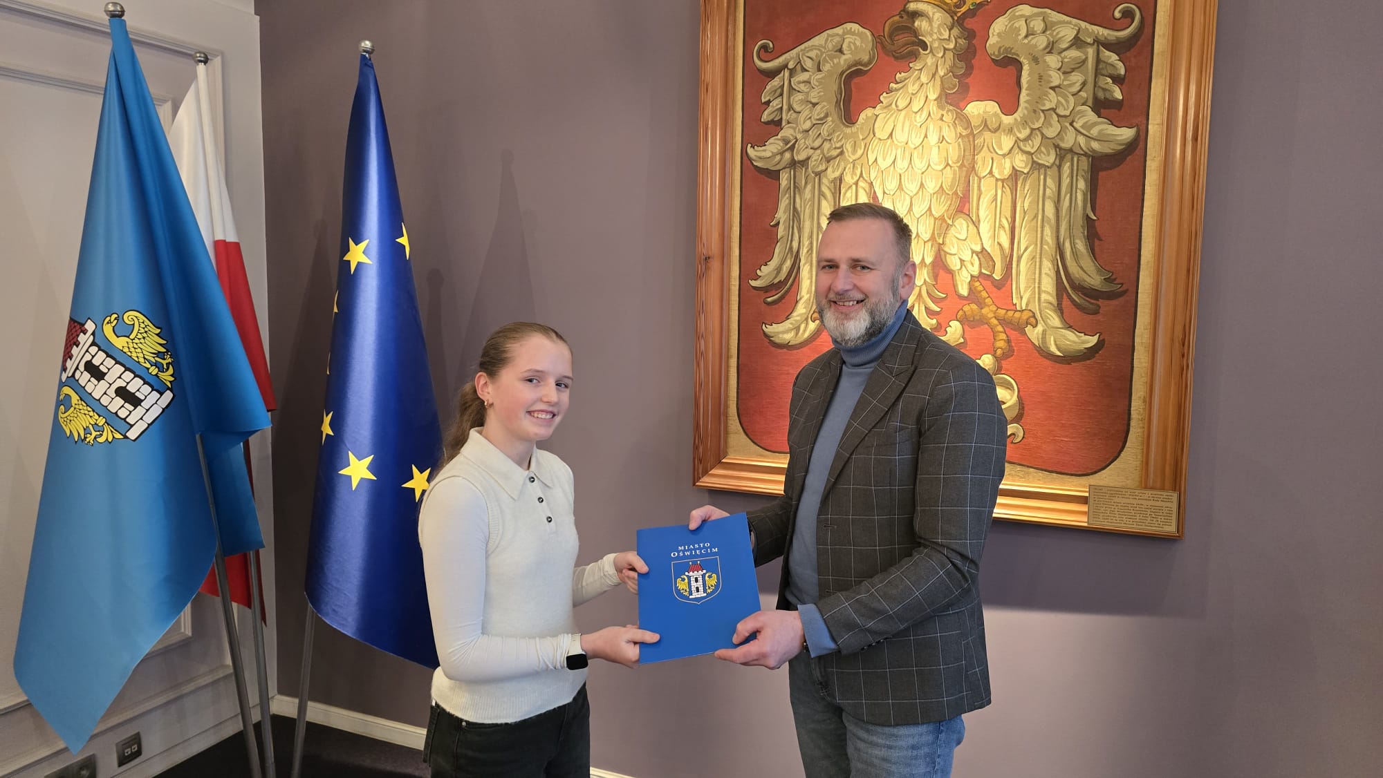 Miasto Oświęcim chętnie wspiera młodych, ambitnych sportowców reprezentujących Oświęcim w różnych sportowych dziedzinach. Tym razem Prezydent docenił Paulinę Cembala, nastoletnią cheerleaderkę z drużyny SHAKE MDK w Oświęcimiu, laureatkę III miejsca zdobytego podczas „VIII Mistrzostw Polski w cheerleadingu sportowym 2025”.
