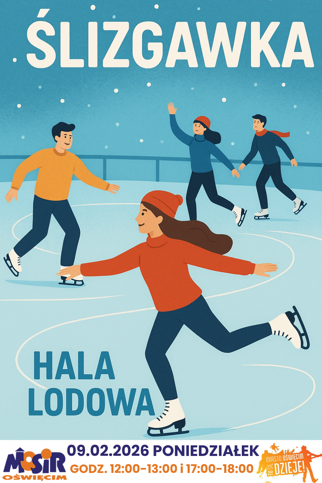 Miejski Ośrodek Sportu i Rekreacji w Oświęcimiu zaprasza na ślizgawkę, która odbędzie się 9 lutego w godzinach od 12:00-13:00 i 17:00-18:00 na Hali Lodowej, przy ul. Chemików 4.