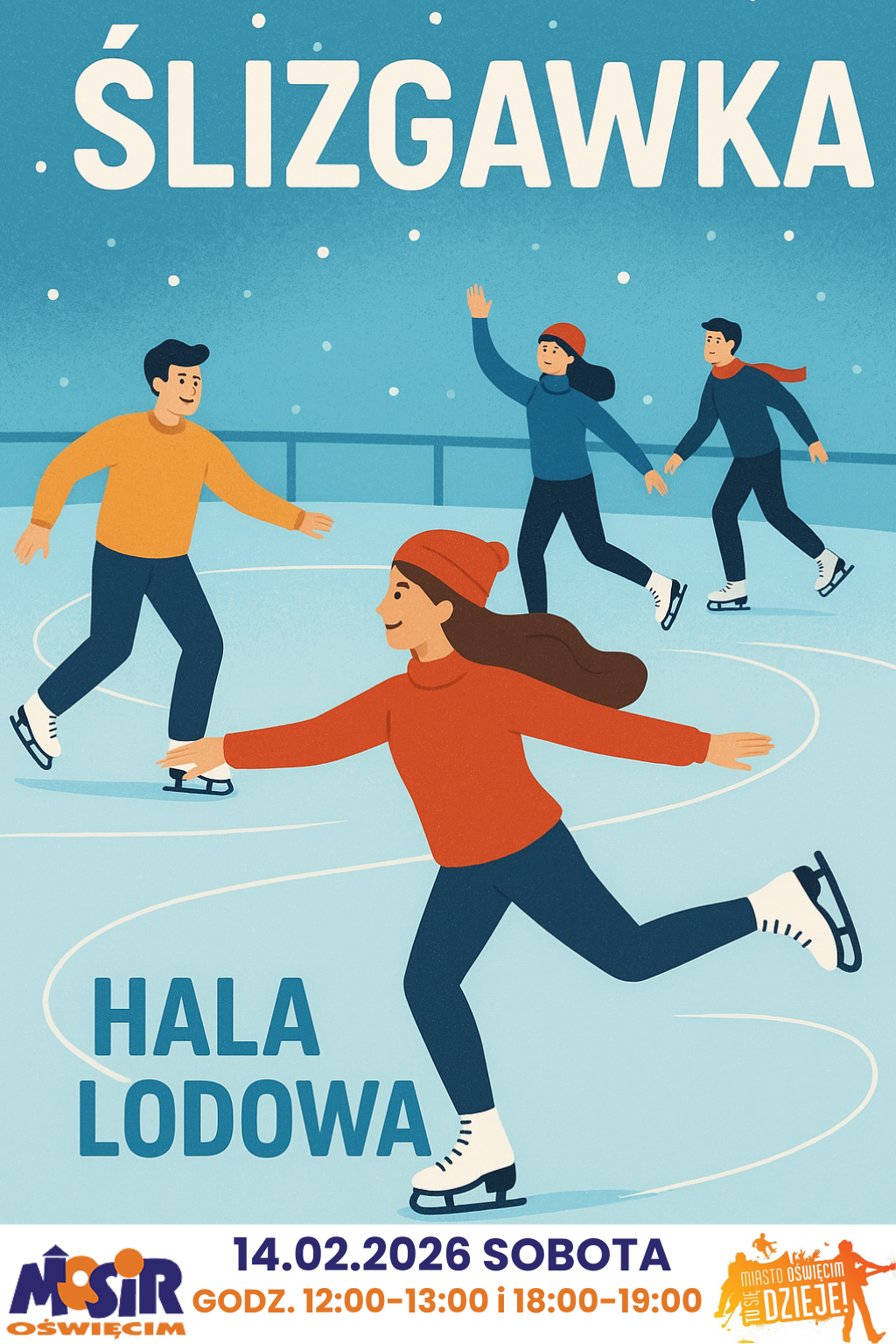 Miejski Ośrodek Sportu i Rekreacji w Oświęcimiu zaprasza na ślizgawkę, która odbędzie się 14 lutego w godzinach od 12:00-13:00 i 18:00-19:00 na Hali Lodowej, przy ul. Chemików 4.