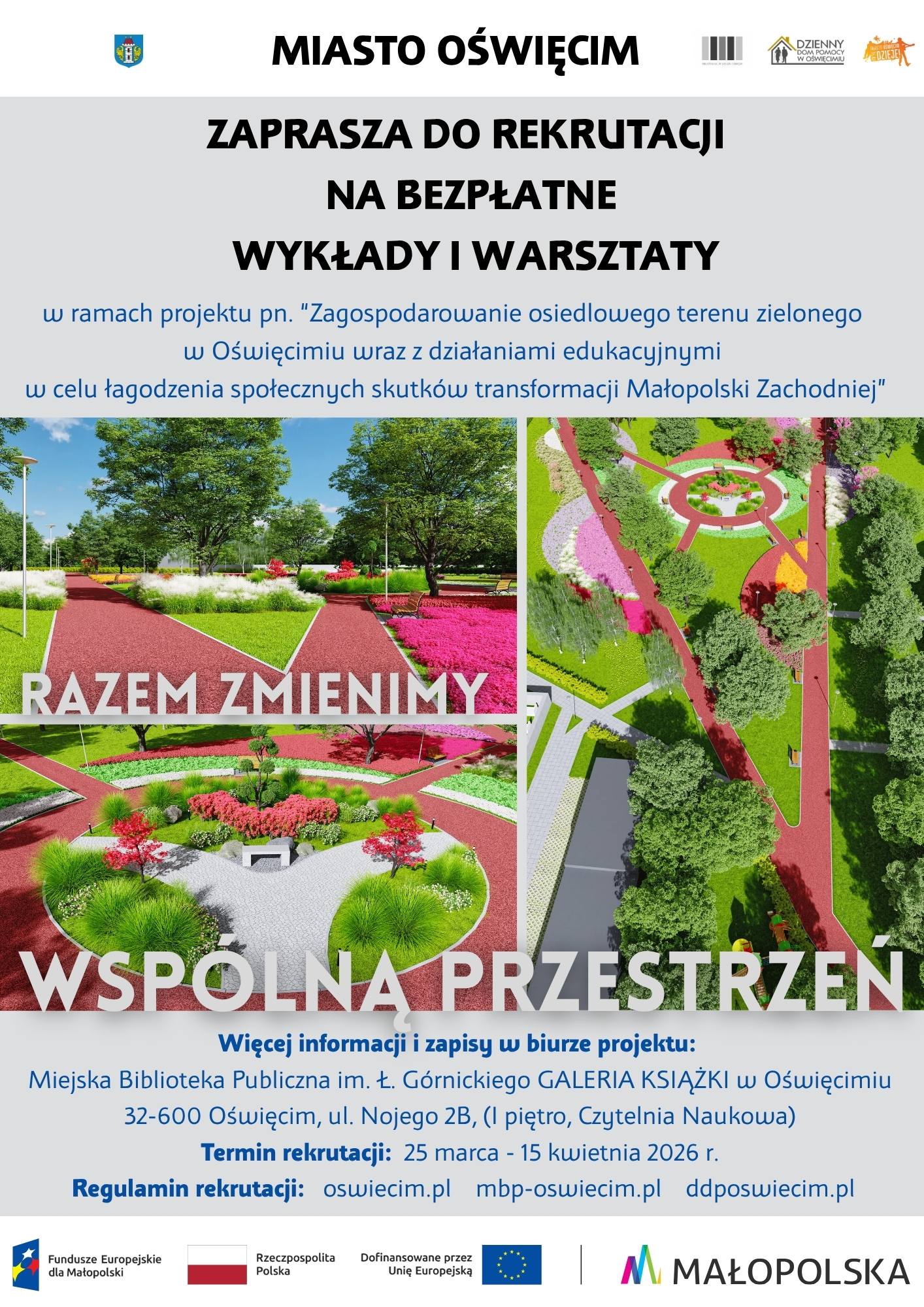 Miasto Oświęcim otrzymało dofinansowanie z Programu Fundusze Europejskie dla Małopolski 2021-2027 dla projektu pn. Zagospodarowanie osiedlowego terenu zielonego w Oświęcimiu wraz z działaniami edukacyjnymi w celu łagodzenia społecznych skutków transformacji Małopolski Zachodniej w wysokości 716 584,72 zł.