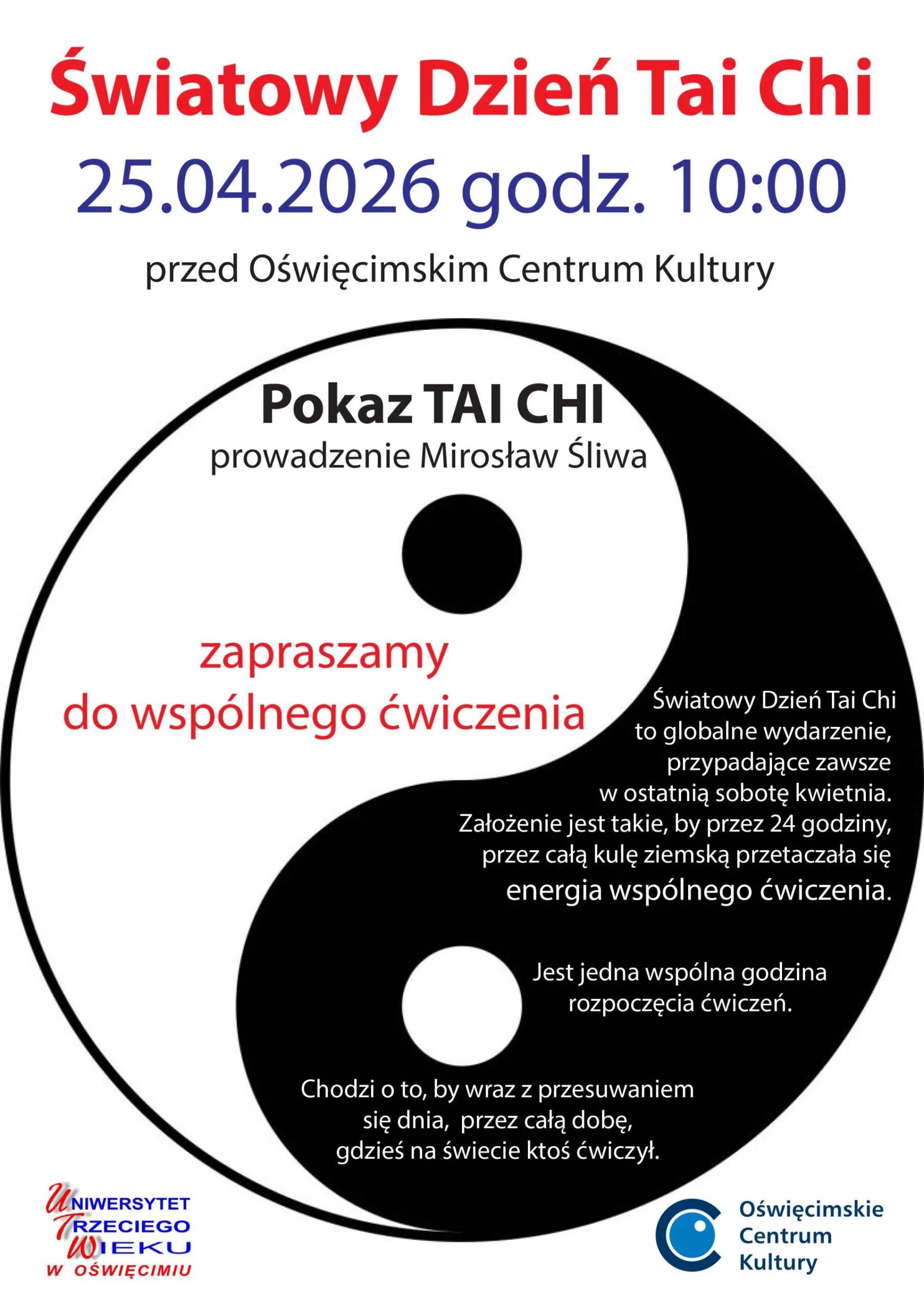 25 kwietnia 2026 roku o godzinie 10:00 – w Światowym Dniu Tai Chi – zapraszamy do wspólnego ćwiczenia przed budynkiem Oświęcimskiego Centrum Kultury.