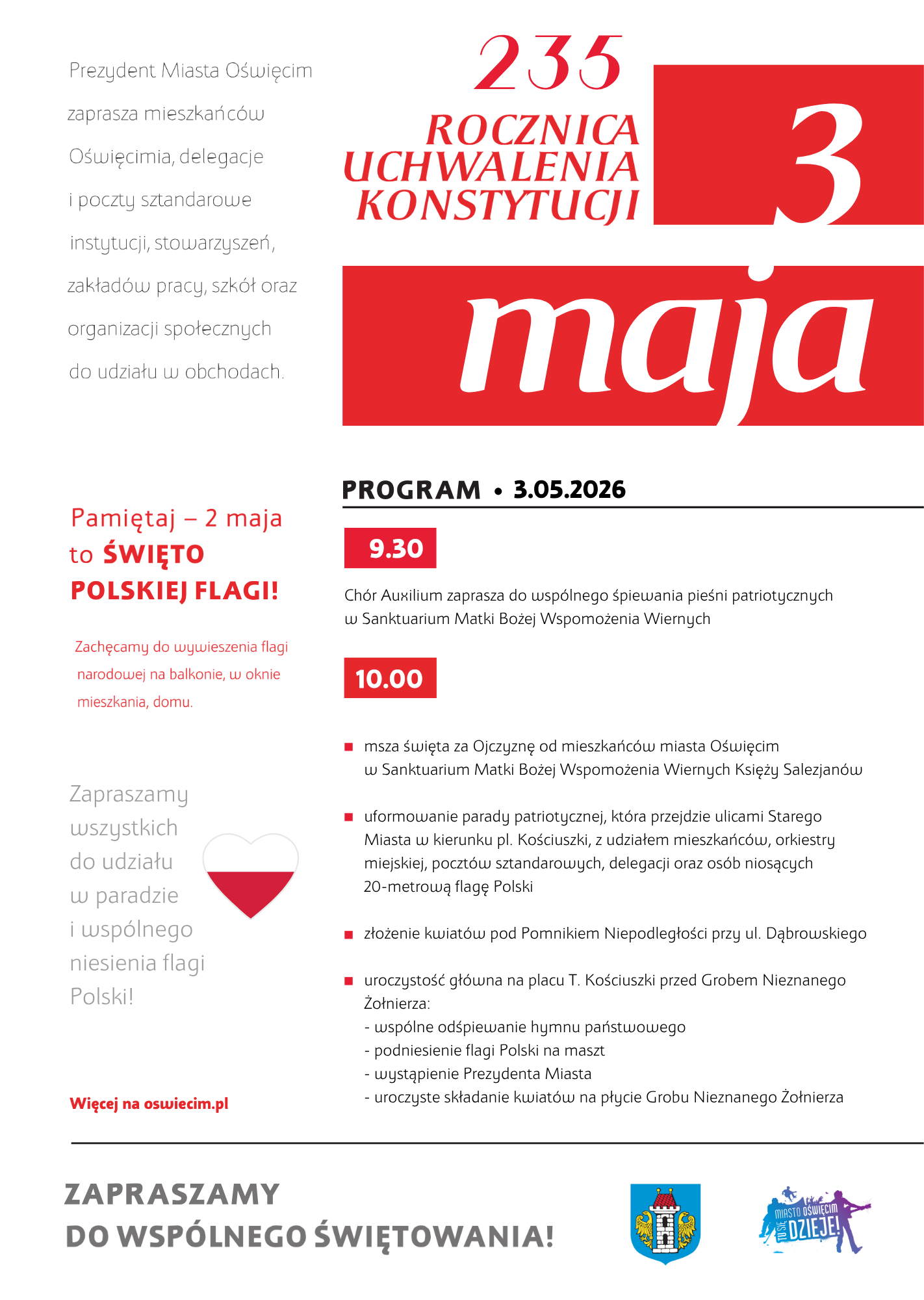 Urząd Miasta Oświęcim, podobnie jak w latach poprzednich, zaprasza dzieci, młodzież i dorosłych do wspólnego niesienia WIELKIEJ FLAGI POLSKI podczas miejskich obchodów rocznicy uchwalenia Konstytucji 3 maja.