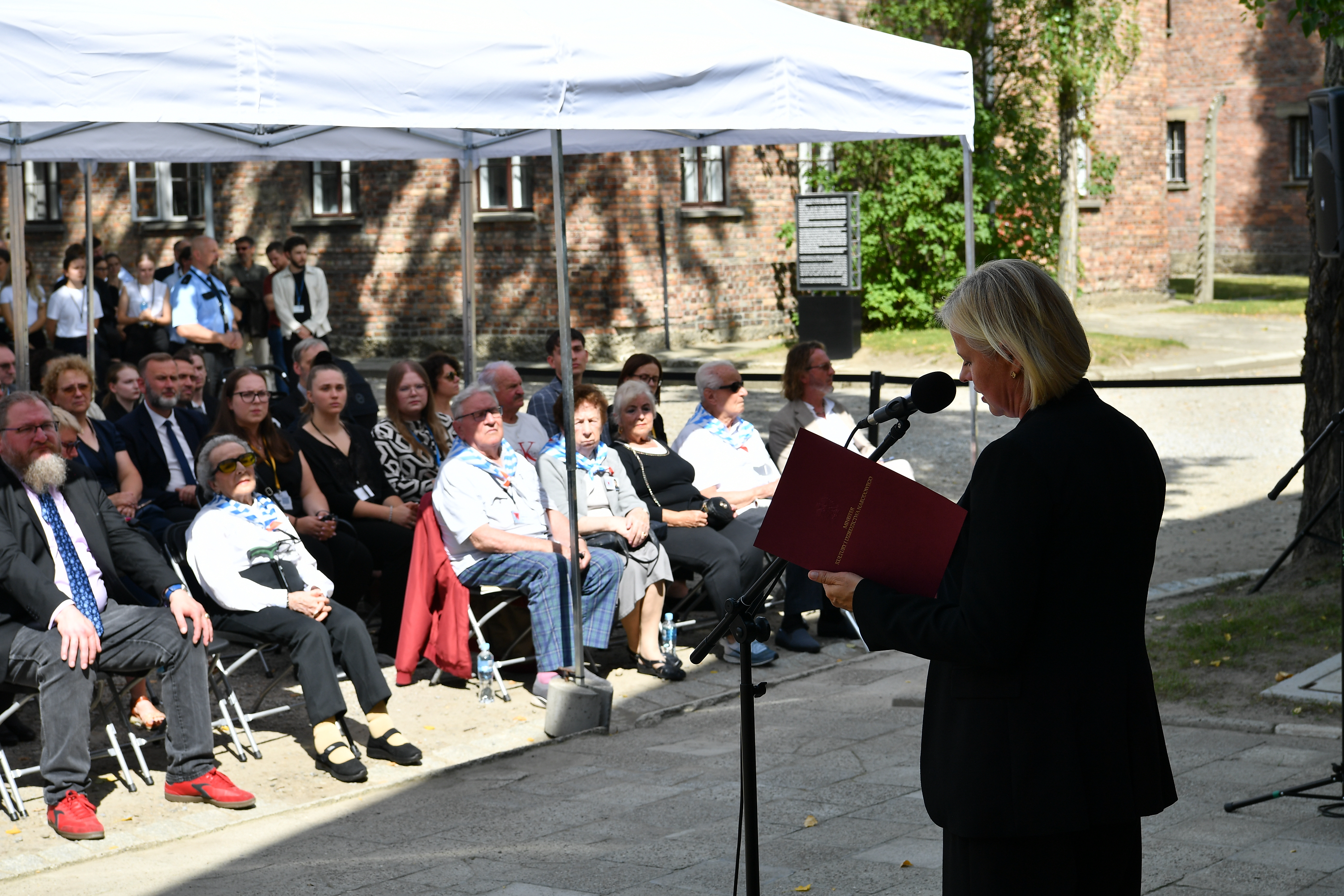 Odczytała także list skierowany do uczestników wydarzenia przez Minister Kultury i Dziedzictwa Narodowego Martę Cienkowską. „Pragnę podziękować dyrektorowi muzeum, dr. Piotrowi Cywińskiemu, a także wszystkim twórcom nowej ekspozycji, kuratorowi dr. Piotrowi Setkiewiczowi, koordynatorowi projektu Robertowi Płaczkowi oraz wszystkim pracownikom i wolontariuszom zaangażowanym w realizację tego przedsięwzięcia. Dzięki Państwa pracy powstała wystawa, która nie tylko upamiętnia, lecz również edukuje. Będzie ona stanowić ważne wprowadzenie do narracji przewodników o genezie KL Auschwitz. Przybliżając początki wojny, niemiecką okupację Polski, a także skalę prześladowań, planowość aresztowań dokonanych przez niemiecką policję oraz towarzyszące im bezprzykładne okrucieństwo. W czasie, gdy odchodzą ostatni naoczni świadkowie i ocalali, spoczywa na nas wspólna odpowiedzialność, by chronić i pielęgnować pamięć” – napisała minister Cienkowska.